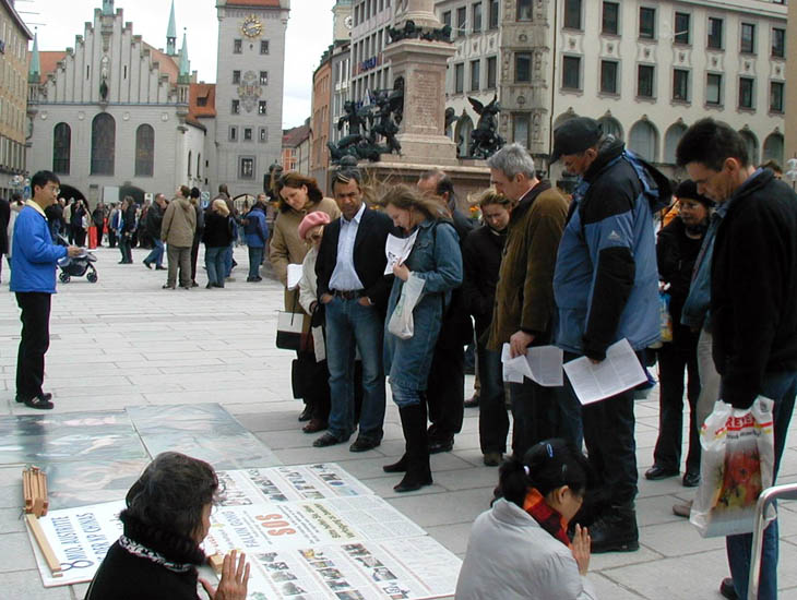 这是发生在德国慕尼黑(Munich)市政厅前的玛琳广场(Marienplatz)上的一幕,2006年3月25日,德国法轮功学员举办了揭露中共苏家屯集中营虐杀、贩卖法轮功学员器官的活动,被真相震惊的人们,踊跃的签名谴责中共兽行。