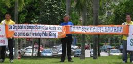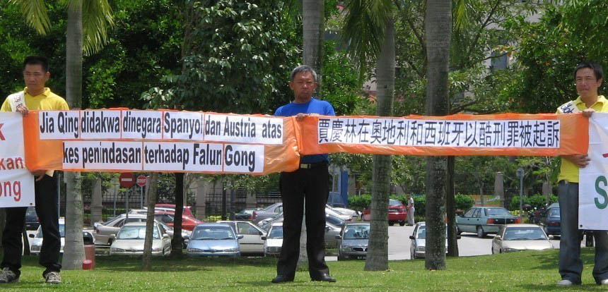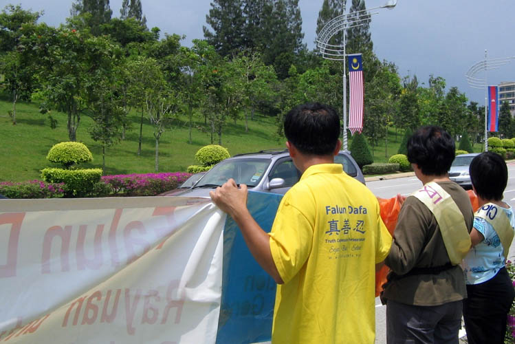 法轮功学员在首相署前的主要公路旁,拉开“法轮大法好”、“停止迫害法轮功”和“贾庆林在国外以酷刑罪被起诉”等横幅,等候贾庆林的座车经过,向他抗议中共迫害法轮功。在法轮功学员举起横幅抗议后不久,贾庆林的座车就经过了抗议地点。法轮功学员表示,他们以后会向每个到马访问的曾参与迫害的中共官员抗议中共迫害法轮功。