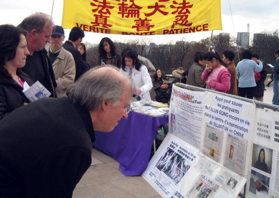 来自中国大陆的游客在法国看到法轮功学员自由的炼功,很惊异。他们默默的看着,在揭露中共恶党秘设苏家屯集中营的图片前停留,从他们惊讶表情中可以看到他们内心的震动。