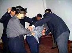 ![]() 演示图:“挂”在墙上 | ![]() 演示图:恶警犯人暴打法轮功学员 |
