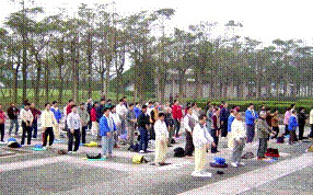 ![]() 2005年12月25日,4千多名法轮功学员在台北市中正纪念堂广场前排组法轮图形 | ![]() 台湾各地大街小巷都可见学员炼功洪法 |