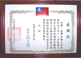 ![]() 台湾监狱的受刑人学炼“神通加持法” | ![]() 台湾台中看守所感谢状 |