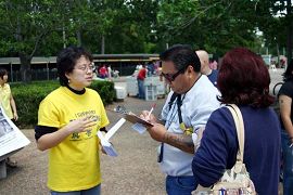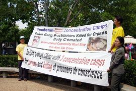 一位美国中年男士当看到横幅,听完真相后,开始询问有关器官移植的事情:“在美国与中国在器官移植上有什么不同呢?”在医学中心上班的法轮功学员彭女士告诉他:“在美国等待器官移植的病人需等待几个月或更长,可是在中国等待器官移植仅一周,因为有大量法轮功学员被秘密关押,作为活体摘除之用。”男士听完吃惊不已。他又问道:“中国人愿捐献器官吗?”学员彭女士回答他:“在美国也许有人愿意在死后捐献器官,在中国古老的文化有‘死后入土为安’风俗,可现在中共却在对法轮功学员活体摘除器官。”男士问了很多问题,学员彭女士一一回答。