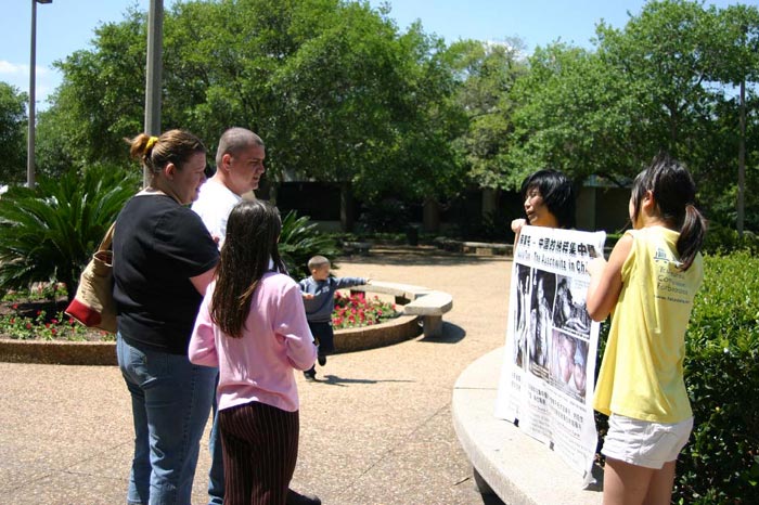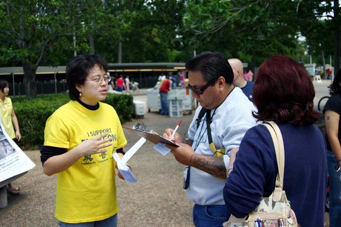 为了让市民知道中共的邪恶本质,让更多的人知道中共集中营迫害法轮功学员的惨绝人寰的状况,休士顿法轮功学员于2006年4月8日上午十一点至下午三点,先后在荷门公园(Hermann Park)、动物园的附近等处拉起了横幅,开始向市民讲真相,揭露中共集中营的罪行。