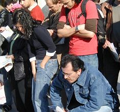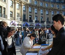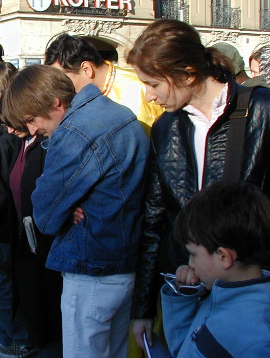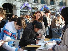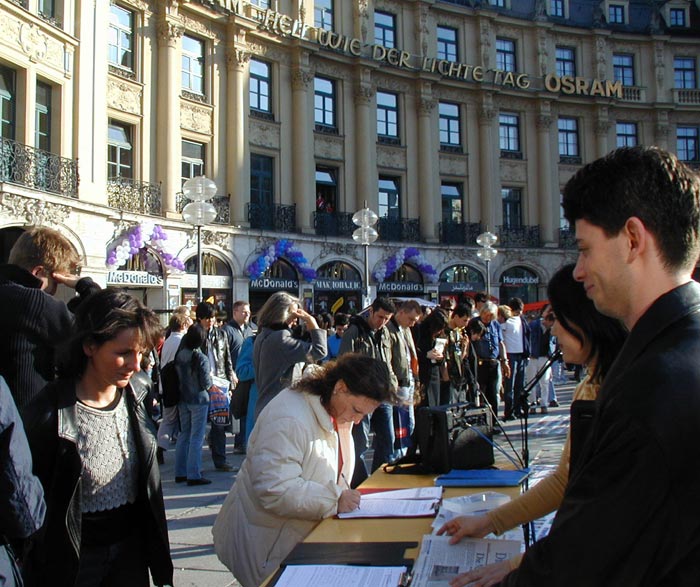 慕尼黑是国际名城,较好的保留了巴伐利亚州文化和传统,是德国唯一不允许设立赌场的州,大部份居民信奉天主教,行为上较保守。8日是周六,天气难得十分晴朗,加上今年6月将在慕尼黑举办的世界杯足球赛又吸引了大量的游客,因此卡尔斯广场上人潮如织,法轮功学员刚将标有“抗议中共集中营设焚尸炉 贩卖法轮功学员器官”中德文横幅挂上时,就围上来大量的民众观看。法轮功学员将明慧网4月5日《紧急公告》反复用高音喇叭播出,了解了真相的民众纷纷签名谴责中共兽行。
