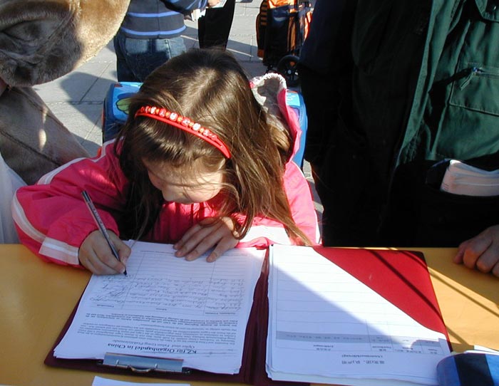 母亲英格·悌罗和不到6岁的女儿萨布依娜前来签名,她认为:“我和女儿来签名,我们觉得那些被关押的人应该得到帮助,人类不能像实验动物那样被对待。纳粹时代已经过去很久了,历史不能再继续重演。”