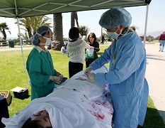 在模拟活体摘器官中表演被迫害者的学员表示,虽然躺在那里但内心翻腾,痛心不已,尤其听到旁边学员解说在集中营中被杀害的同修,活生生的被摘除器官,心情难以平复,呼吁总统布什制止纳粹集中营历史重演,制止中共再继续此残酷罪行。