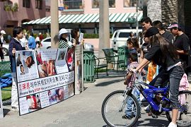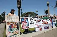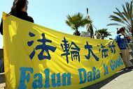 游客莱恩尼尔驻足在横幅标语前、在图片前、在炼功的学员前以摄影机拍下各种情景留下记录。莱恩尼尔表示,中共行为禽兽不如,呼吁总统布什以爱护人民之心情在胡锦涛来美时制止其对自己同胞的残害谋杀行为。