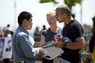在海边值勤的警察,学员也向他们讲述在中国发生的对法轮功学员的迫害,他们表示明白,若非因为值勤身着制服,一定帮忙签名。