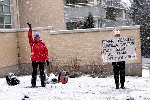 来这里办理签证的芬兰人以及过往车辆中不断的有人关注学员举着的写有芬兰文“中共集中营虐杀法轮功学员,活体摘除器官”的展板。有的甚至暂时停车仔细观看到底发生了什么事。