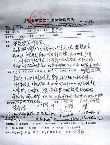 王建国死后被抬到吉林市第二二二医院,据当时大夫做出急诊病历所述:(ID:6156)