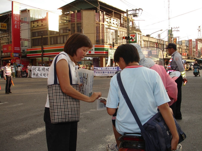 法轮功学员向路人发材料,说明大陆劳教所关押学员,活体摘除器官盗卖,并焚尸灭迹。