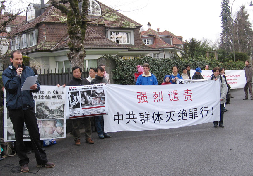 在此紧要关头,为了進一步揭露、抗议和制止中共的滔天罪行,2006年4月13日上午,法轮功学员在中共驻瑞士大使馆前举行了抗议活动。他们打出“强烈谴责中共群体灭绝罪行!”“法办江泽民、罗干、周永康、刘京!”等诸多横幅。学员代表宣读了“赴中国大陆全面调查法轮功受迫害真相委员会”的成立公告;宣读了对中共群体灭绝罪行的揭露材料,并希望中共使馆的工作人员为了自己的未来,能够尽早明白真相,不要再受中共蒙蔽,不要再为其充当帮凶。