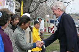 ![]() 大卫-乔高(David Kilgour)和法轮功学员一一握手 |