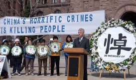 前来支持的多伦多市议员Michael Walker指出,人来到世间都有平等的权利,一个人的权利被践踏,所有人的权利都受到威胁。活体摘取人的器官并焚尸灭迹是一个国家所能犯的最严重罪行了,民主世界不能保持沉默。