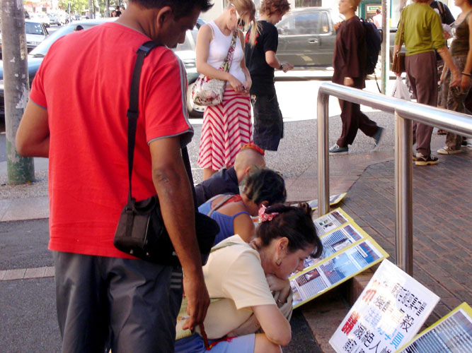 中午时分,来自大陆的旅行团纷纷前往中国城用餐,很多人看到了标语、展板;有的开始拍照,有的若有所思的接过学员手中的真相资料。