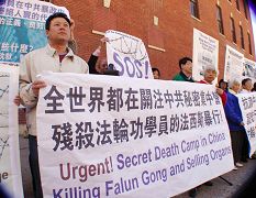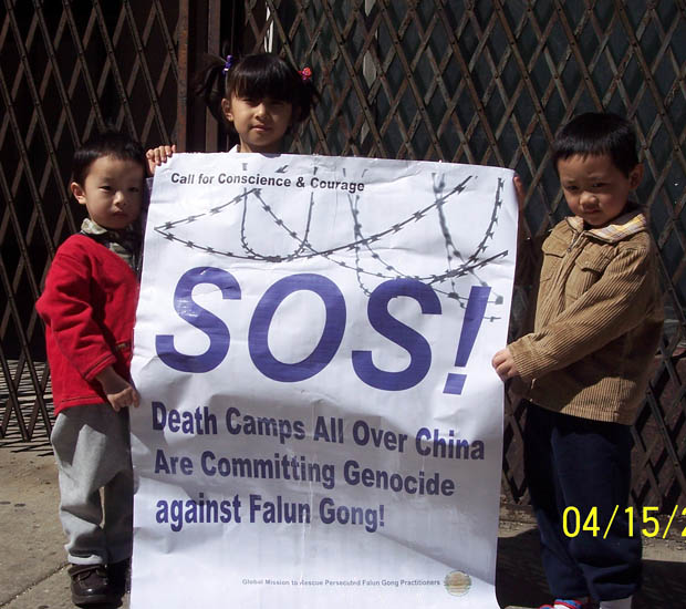 ![]() 明慧学校小弟子们在路边举“SOS”横幅 |