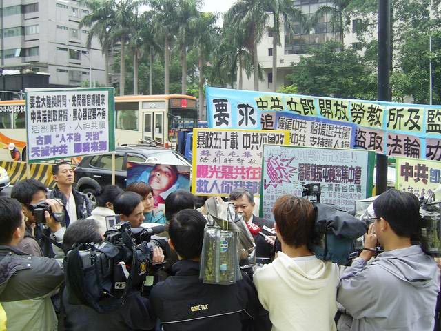 ![]() AIT现场外有多名法轮功学员举真相展板 |