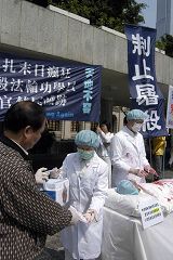 200多名香港法轮功学员2006年4月17日举行以“呼唤良知 制止屠杀”为主题的集会游行,紧急呼吁国际社会制止中共针对法轮功的灭绝屠杀。