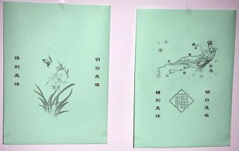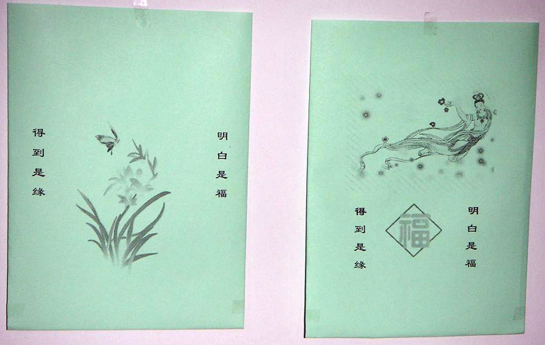 注:考虑到同修也许选用白色或彩色的包装纸,所以我们提供了彩色和灰度(黑白)两种设计图。可以根据打印机的属性的不同,自行调整图案的深浅。方法是:打开设计稿,用左键点击一下图案,在word上方的栏目中将“图片”选中,有两个明暗各一半的圆就是调节明暗度的。