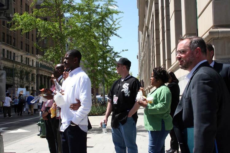 游行正值午休时间,许多在附近政府部门、公司、智库工作的人们都在街边驻足观看。在游行队伍的不同地段都有学员用高音喇叭向路人播放着对法轮功的介绍和发生在中国的这场迫害的概况,同时也播放了由西人法轮功学员创作的、并在最近的第七届年度美国最佳歌曲奖中获得歌词创作荣誉奖的歌曲“让他们自由”。