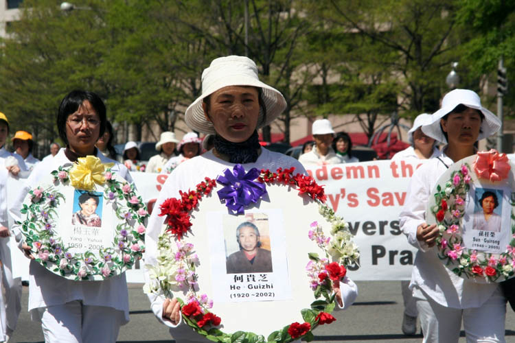 学员们都胸戴白花,表情凝重,整个游行队伍庄严肃穆。走在队伍最前面的是“法轮大法好”和“停止迫害-呼吁调查中国的劳教所和监狱”的横幅,紧随其后的是书有“念”字的巨大花圈,和几十位身着白衣、手捧被迫害致死的法轮功学员遗照的女学员。