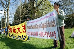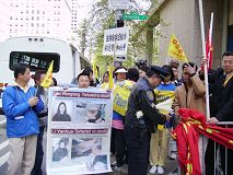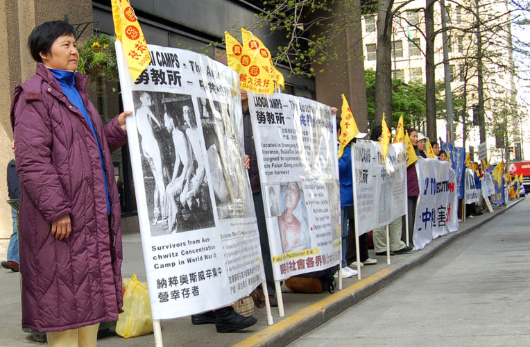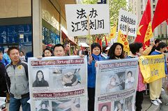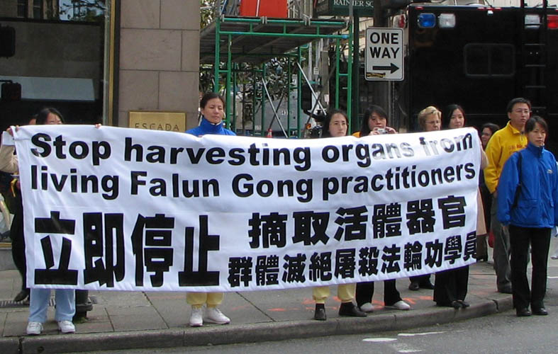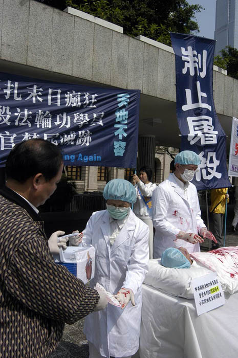 ![]() 在集会上模拟演示中共活体摘卖器官 |
