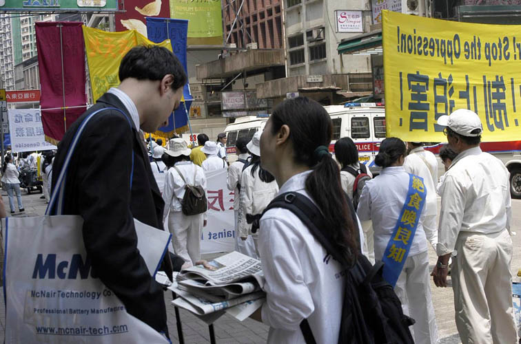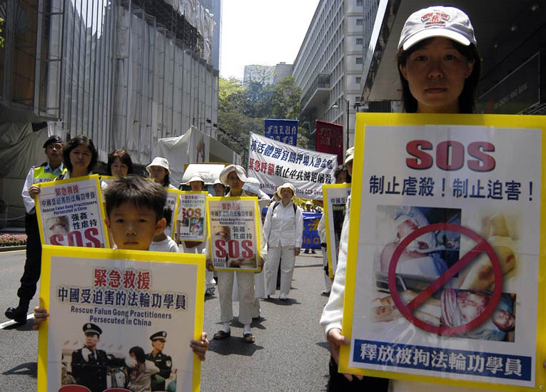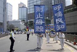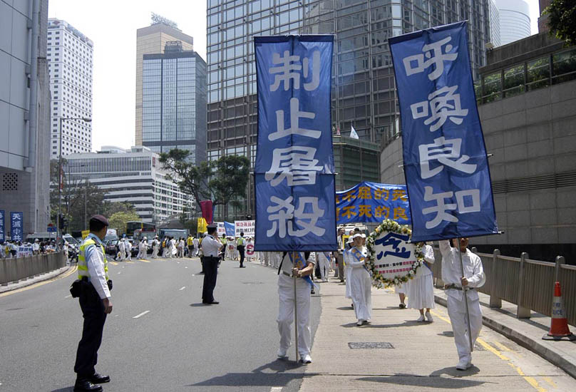 【明慧网2006年4月19日】200多名香港法轮功学员2006年4月17日举行以“呼唤良知 制止屠杀”为主题的集会游行,紧急呼吁国际社会制止中共针对法轮功的灭绝屠杀。香港政界领袖司徒华及何俊仁齐来声援,他们在谴责中共活体摘取法轮功学员器官暴行的同时,支持全球法轮功学员的倡议,呼吁国际社会对中共劳教所等关押场地进行全面独立调查,以揭露迫害真相。