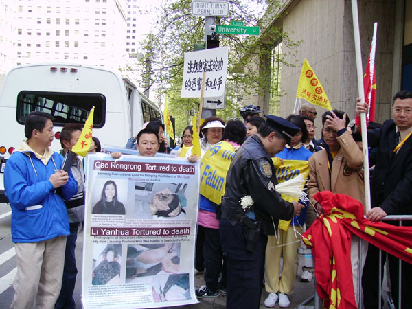 ![]() 法轮功学员在中联办外宣读声明 | ![]() 在中联办外悼念遇害的学员 |