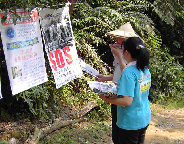 一群大学生经过时,听了学员的陈述,表示他们会上网了解更多消息。其中一个女大学生主动伸出手来说:“给我一张海报,我也要关心一下这件事情!”有一位登山客问:“可是觉的这件事情似乎离我们很遥远啊!”学员告诉他:“不管我们身在哪里,关怀的心是一样的,当有一天我们听到有人还在被中共蒙骗帮着散播谎言时,我们哪怕只是简单的告诉他一句话,也许就帮助了那个人不成为恶人的帮凶,人人都这样做,那力量是不可轻忽的!而且对人对己都是莫大的福报啊!”这个朋友一听,就开始认真的对整个事件加以了解,频频的点头表示对学员观点的赞同,也说他要上网多加了解!