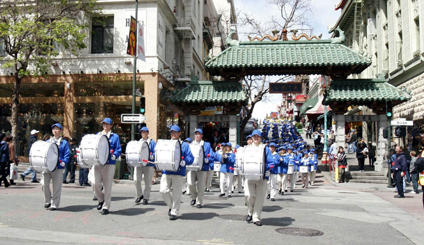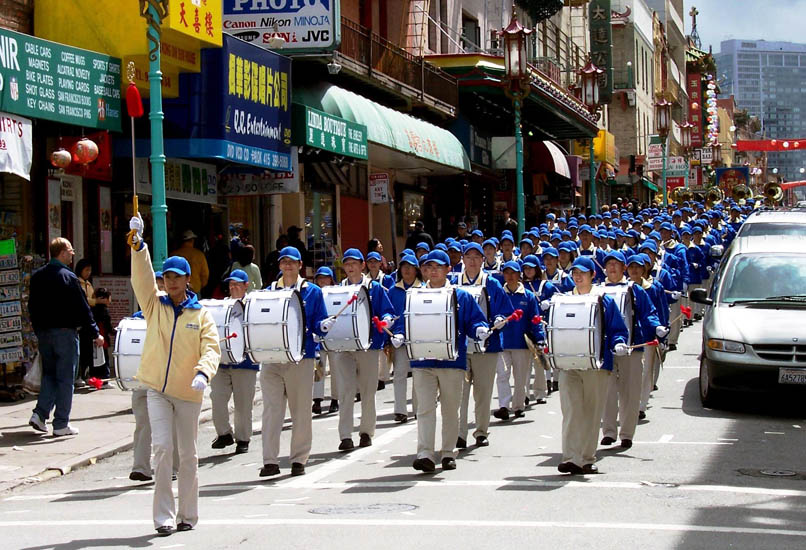游行份外引人瞩目的是:身穿印有法轮大法字样蓝色上装、米色长裤的150多位成员组成的天国乐队,以及揭露苏家屯集中营黑幕的真相酷刑车和图片。声势浩荡的队伍,雄壮的鼓号声,震撼着几乎整个中国城,所经之处不仅街上行人驻足观看游行全程,沿途大楼的工作人员、及商家也走了出来观看,有的店铺员工透过橱窗玻璃仔细读着横幅上的讯息。
