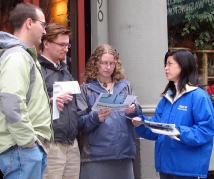 士德顿街─湾区居民购物买菜集中地。当队伍经过时,那些忙于购物的人立刻将注意力转向游行队伍,其中很多华人长时间呆立注视。许多人虽然还不敢对法轮功直接表态,不过他们却对阵容庞大的天国乐队赞美不已。
