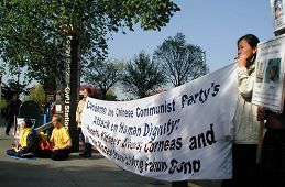 2006年4月16日,匈牙利法轮功学员在中使馆前冒雨抗议中共近七年来对法轮功的残酷迫害,并呼吁社会各界关注最新揭露出来的中共劳教所等地活体盗取法轮功学员器官,并焚尸灭迹的法西斯暴行。