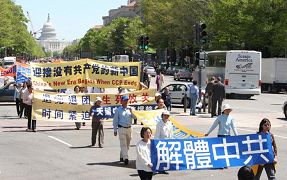 “声援千万退党”盛大游行绵延数十街区,声势浩大,引人瞩目2006年 4月19日下午,全球退党服务中心在美国首都华盛顿举办了一千两百多人参加的“声援千万退党团盛大游行”。