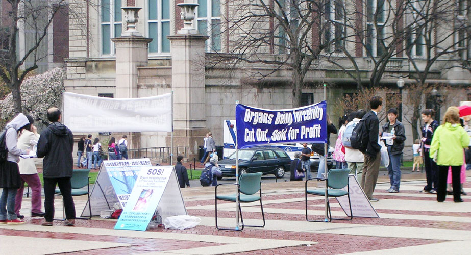 【明慧网2006年4月20日】2006年4月13日下午,法轮功学员在美国哥伦比亚大学校园中心的广场(Low Plaza)悬挂横幅、展板,散发传单,揭露中共劳教所、集中营活体摘取法轮功学员器官获利并焚尸灭迹的暴行。这天一直时断时续下着雨,但经过的人们看到揭露