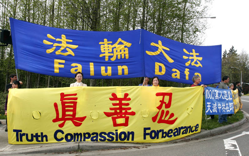 在星期三胡锦涛一行到波音公司访问时,法轮功学员在外面请愿。一位叫Katherine的西雅图人过来帮助举着横幅,并学会了用中文喊“法轮大法好”的口号。她对记者说,我看了法轮功的资料,我认为中共对法轮功的迫害十分荒唐。很明显,法轮功是非常美好的事情,可是中共却不允许法轮功存在。中共不允许人们拥有和平。中共害怕和平,这说明中共是非常虚弱的。