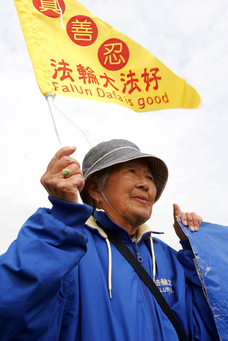 ![]() 路人KATHERINE帮助拿横幅,喊法轮大法好 |