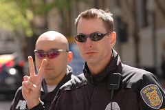 在抗议现场维持秩序的警察向来自旧金山的法轮功学员ROSE女士说,“作为警察,我们不能支持任何一方。可是我们是主持公道的,哪个捣乱我们制止哪一个。”在亲共方人士将中共的血旗挡在法轮功学员的横幅前时,这位警察对亲共人士说,“这位女士早已站在这里了,你不能站在这里,你要到别处去。”