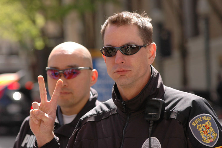 星期二,在微软公司外的大街上,法轮功学员的声援一千万勇士退出中共的真相汽车通过时,维持秩序的警察都竖起大拇指。警察说:私底下,我们都是支持你们的。