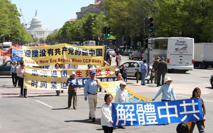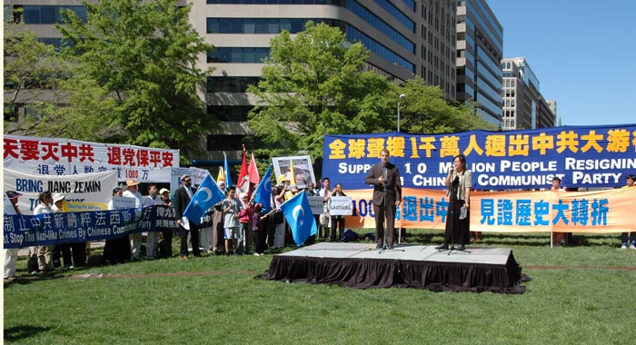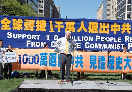 在华盛顿麦佛森广场的集会上,全球退党服务中心主席、审江大联盟主席李大勇博士说,近千万退出中共的民众来自不同的职业,包括工人、农民、警察、律师、国家干部、体坛冠军,而且还包括原中共的军人、警察、特务、公安。这意味着相当一部份中国人已经意识到中共的邪恶,意味着中共解体已经到了临界点,意味着中共已经没有任何方式和力量控制中共解体的命运。