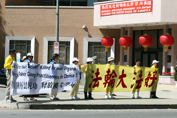中国驻华盛顿的大使馆,是胡锦涛必去之地,法轮功学员也前往打横幅,其间许多西方民众经过皆会向法轮功学员轻鸣喇叭表示鼓励,或摇下车窗竖起大拇指。