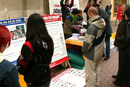 一群吉普赛人听到中共劳教所里发生的非人暴行后,都签下请愿书声援法轮功学员。一位年长的男士在听到真相后,一面走向签署请愿书的桌子,一面大声说道:不,不,没有人能这样做,不能让它发生。一位年老的妇女在学员向她解释中共活体摘除法轮功学员器官的暴行,以及法轮功在中国受到迫害时,她非常激动。她不会读或写,但她向学员表达了强烈的支持和同情。