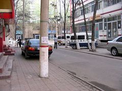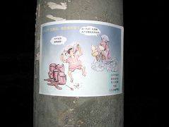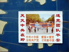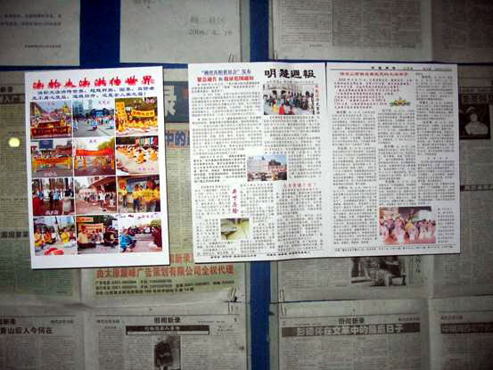 ![]() 桃园正街山西旅游规划中心门牌上的护身符。 | ![]() 太原主要街道新建路汽车站广告栏张贴的“中国活体器官移植的黑幕”。 |