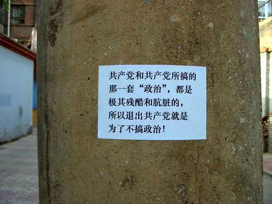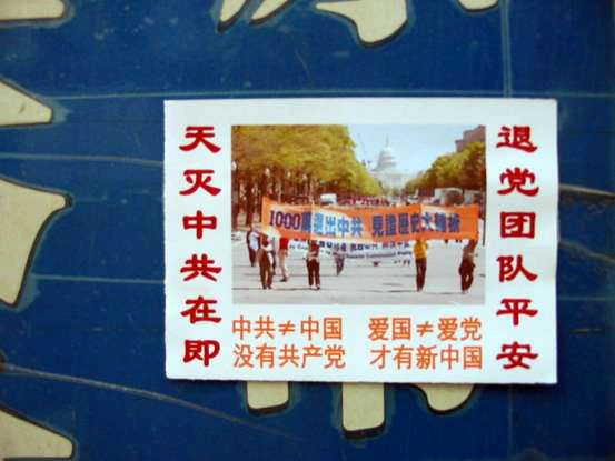 ![]() 新建南路第三社区黑板报张贴的不干胶“请关注沈阳苏苏家屯秘密集中营”。 | ![]() 文源一条 一单位门牌上张贴的“国外大游行:声援1000万退出中共,见证历史大转折”微型不干胶。 |