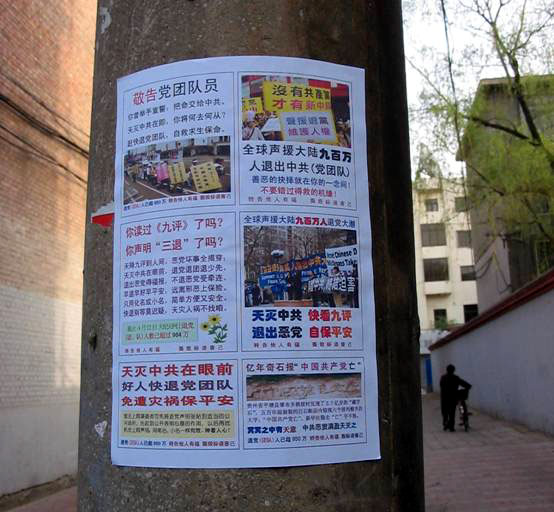 ![]() 张贴在惠民北街电线杆上的不干胶《九评》宣传画。 | ![]() 4月22日早上5点,水西关水一巷报栏张贴的不干胶《法轮大法洪传全世界》、《明慧周报》(山西版)。 |