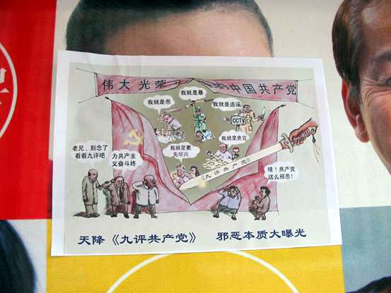 ![]() 太原惠民北巷电线杆上张贴的不干胶“天降《九评共产党》 邪恶本质大曝光”,来往的路人走近观看。 |