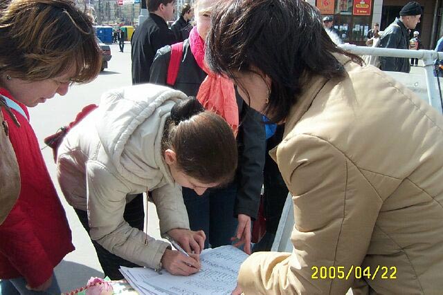 一位老年人走到这里接过真相资料,和学员谈了很久,他说:“共产党和独裁分不开,中共不管是换哪个领导都一样,都是为维护它的政权而不是为人民,有共产党就不可能有信仰自由。为了它的权什么坏事都会干。人民要想有民主和自由,只有共产党下台。俄罗斯人民能有今天的信仰自由和民主权利,虽然还不完善,那也是唾弃共产党的结果。”他主动签名支持法轮功的反迫害。还有好几位老人也都签了名支持法轮功。