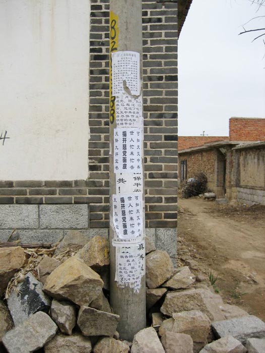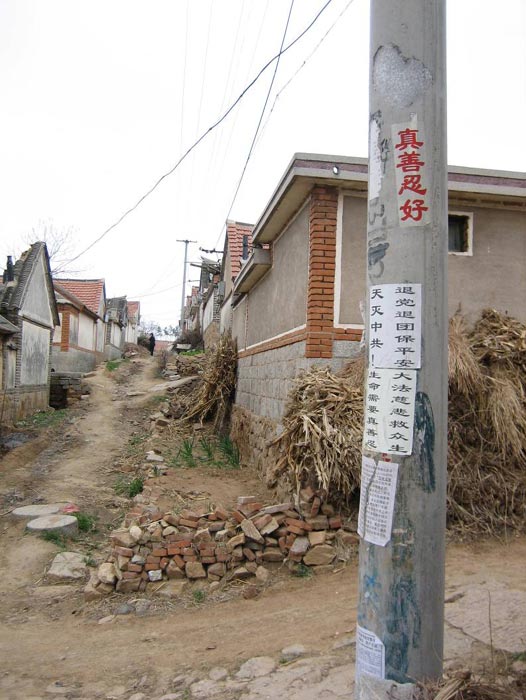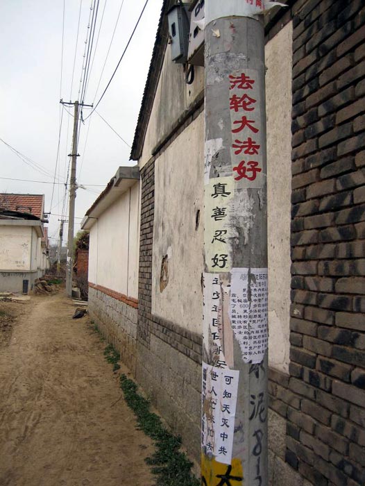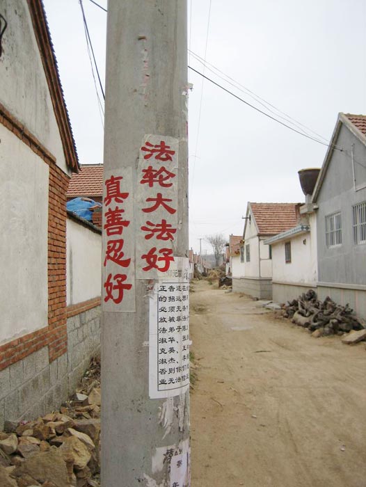 【明慧网2006年4月24日】山东法轮功学员制作张贴的大法真相标语层层叠叠遍布某村子的每个角落。