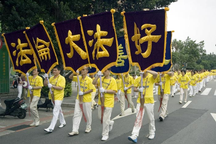 一支由桃竹苗160位学员组成的法轮功功法表演队伍,在行进间将法轮大法的美好传递给路人。台湾NEWS英文版的媒体记者易先生跟着队伍走了近2个多小时,期间他从许多角度拍摄学员演炼功法的镜头!事后他向领队学员表示,他觉得不可思议与敬佩,因为他一路跟下来没听见音乐、没听见口令、竟然学员的动作如此整齐划一、祥和美好,这令他感动万分!