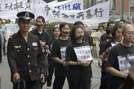 来自台北县三重的学员以行动剧的方式,一身的黑衣及被捂住的嘴巴,呈现法轮功学员在中国大陆劳教所集中营所受的奴役及非人道对待。他们想以此让人民感受到受迫害的真实性,其中一位从事保险业者廖先生饰演公安,他表示他于1998年起就过着洗肾的日子,2001年有幸在公车上看到法轮功的义务教功传单,便走进修炼的行列,如今他的身体得到明显的改善,他的老母亲也跟着一起学炼,老人家不但喜欢读《转法轮》,更重要的是身体健康精神舒爽,一点都无须晚辈的操心。